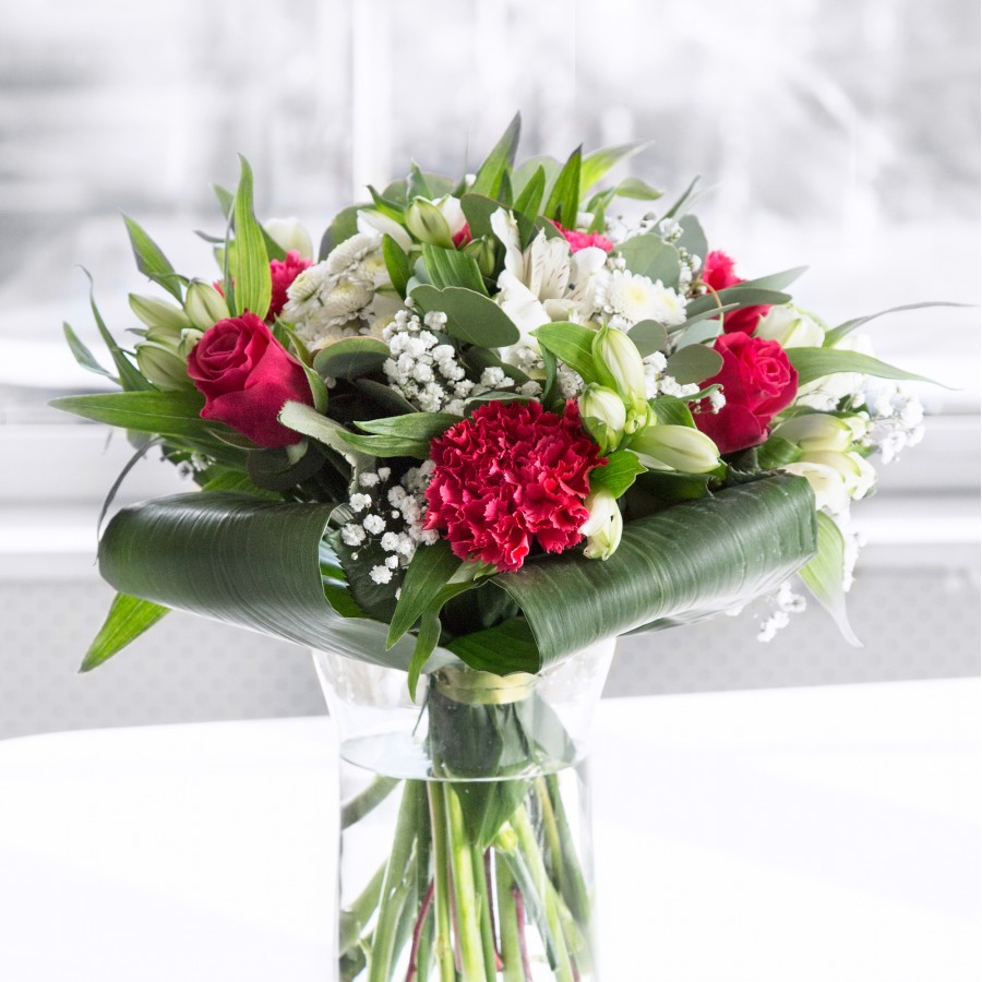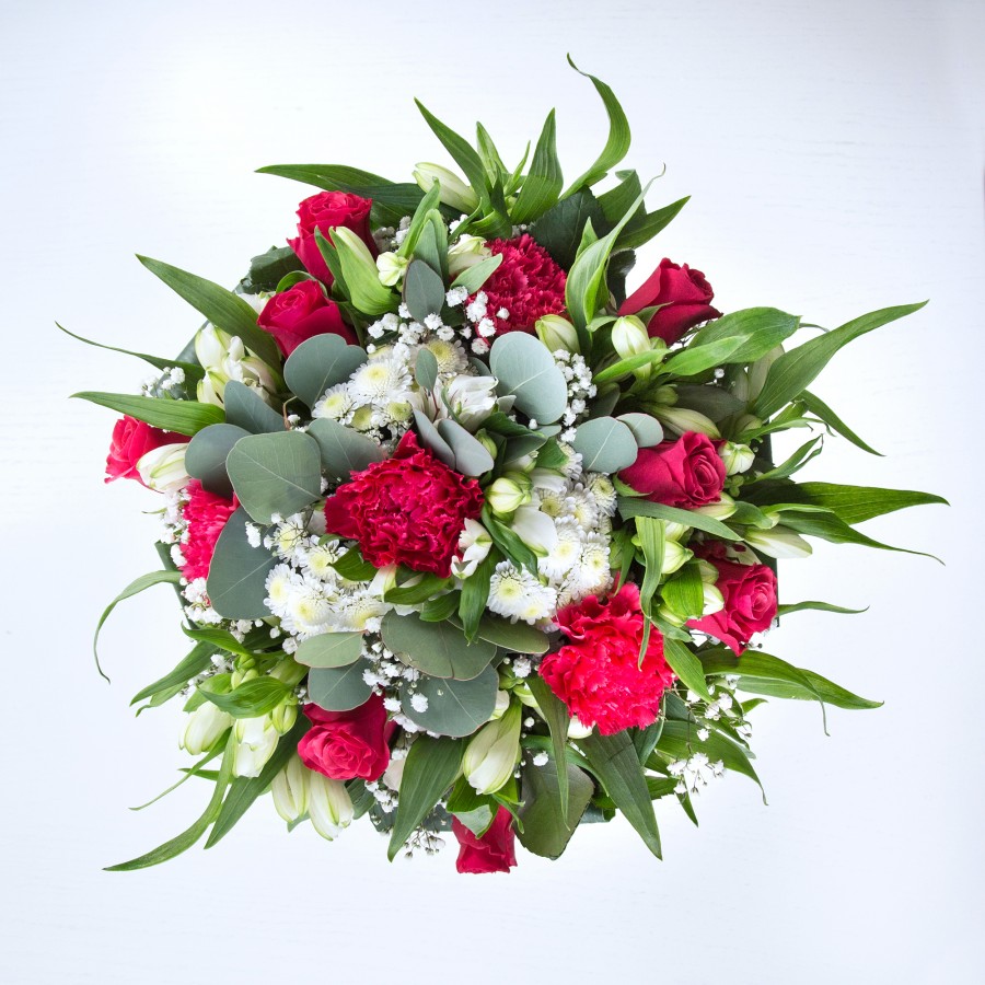 Discover the exquisite beauty and unique design of our premium bouquet. This arrangement showcases sweet white chrysanthemums, opulent red roses, delicate gypsophila, vibrant carnations, pristine white alstroemeria, and lush aspidistra leaves, all expertly combined for a luxurious presentation.