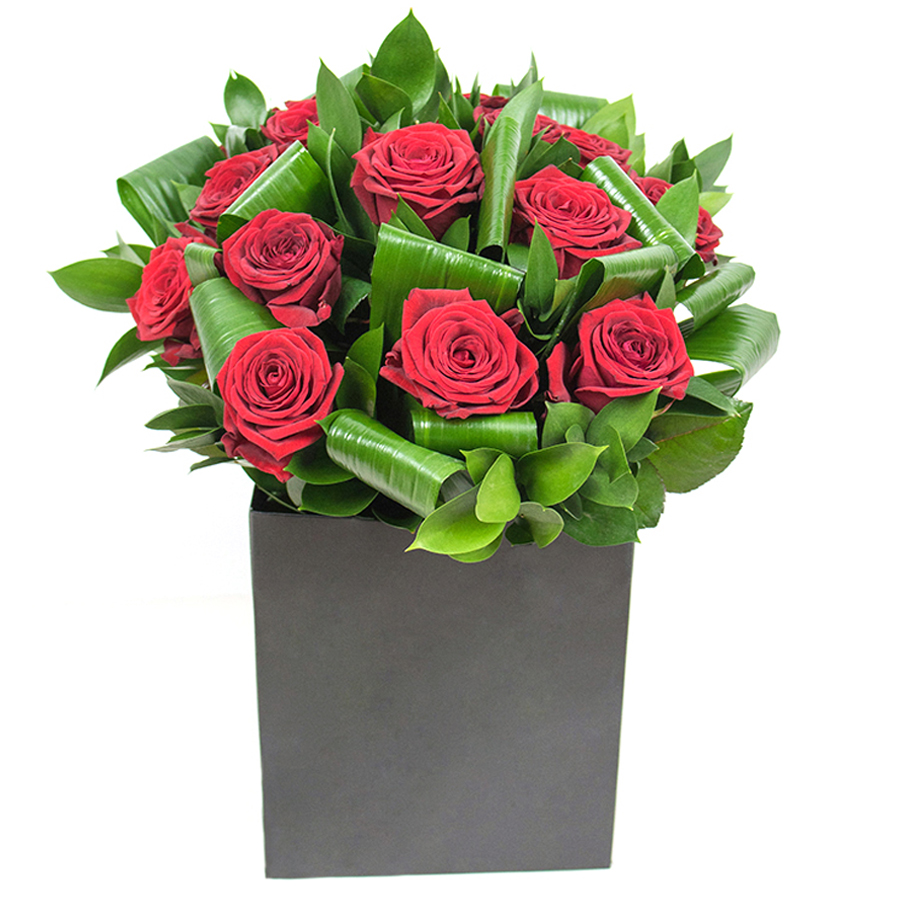 Introducing our exquisite floral arrangement that transforms any space into a haven of elegance. Vibrant red roses take center stage, artfully combined with lush aspidistra leaves and delicate ruscus accents. Every bloom is hand-selected to ensure superb quality and remarkable freshness, promising a luxurious gift experience.
